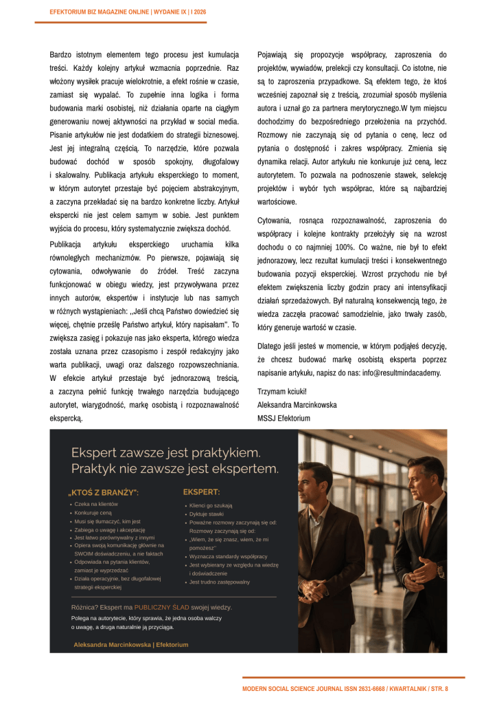Marka eksperta rozwija się poprzez konsekwentne komunikowanie tych pięciu filarów w jednym ekosystemie. Kanał komunikacji staje się przestrzenią, w której widoczna jest wiedza, doświadczenie, specjalizacja, metoda i ich zastosowanie. Regularność utrwala skojarzenia, a skojarzenia budują pozycję.